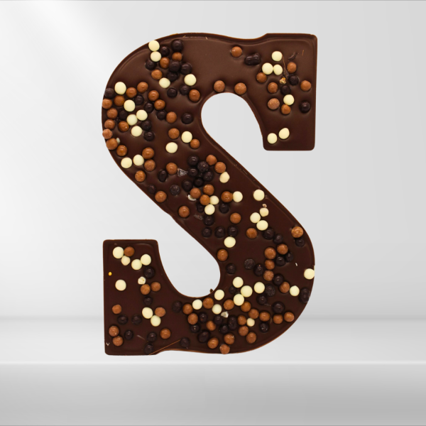 Chocolade letter S crispy. Verkrijgbaar in melk, witte en pure chocolade.