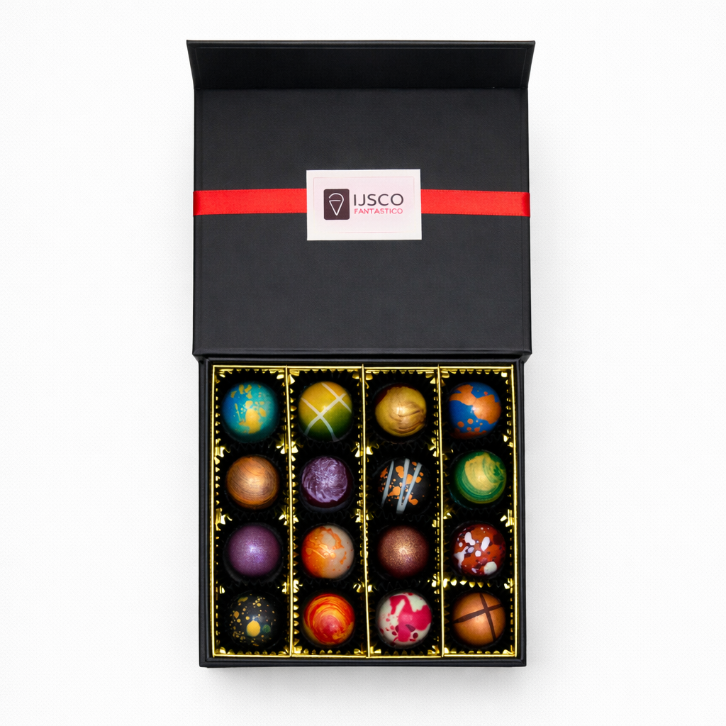 De bonbons worden met zorg verpakt in een luxe magneetdoos met rood lint, perfect om cadeau te geven of om jezelf te verwennen.