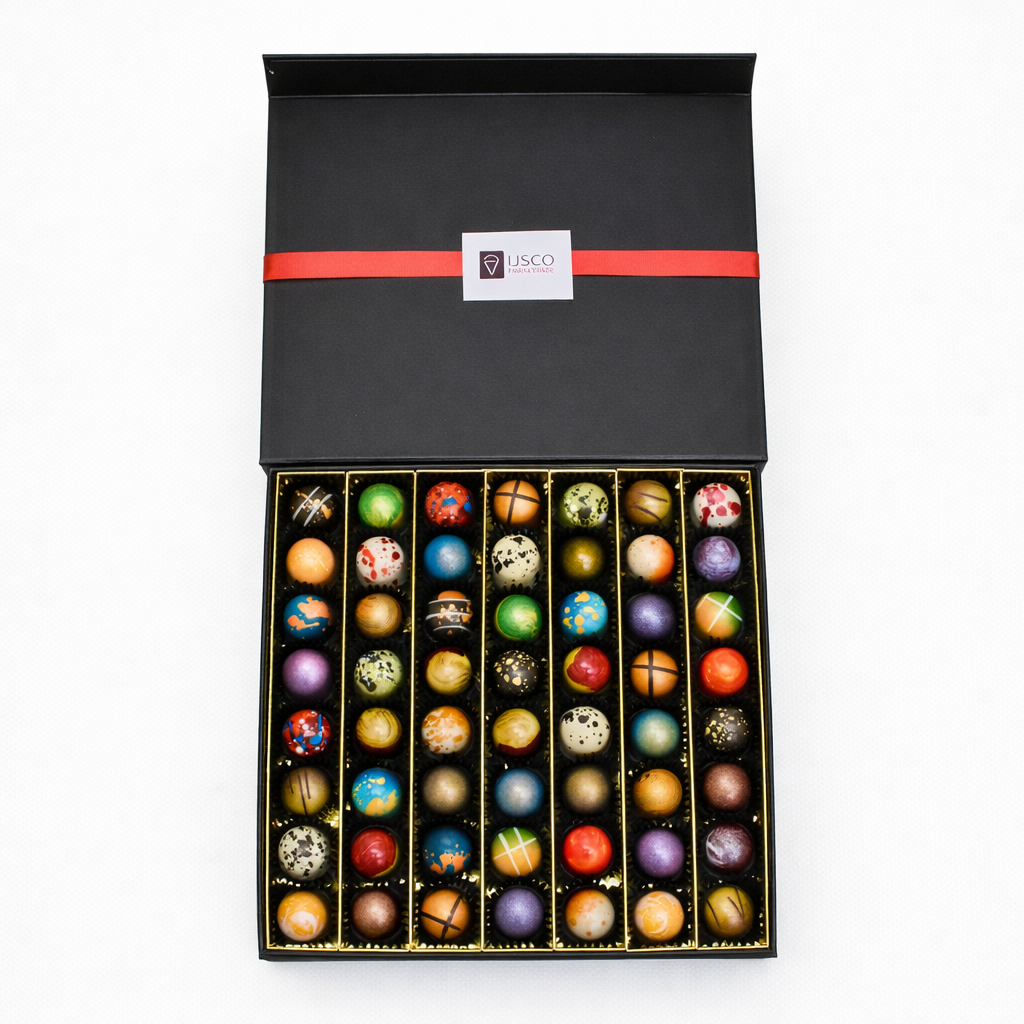 De bonbons worden met zorg verpakt in een luxe magneetdoos met rood lint, perfect om cadeau te geven of om jezelf te verwennen.