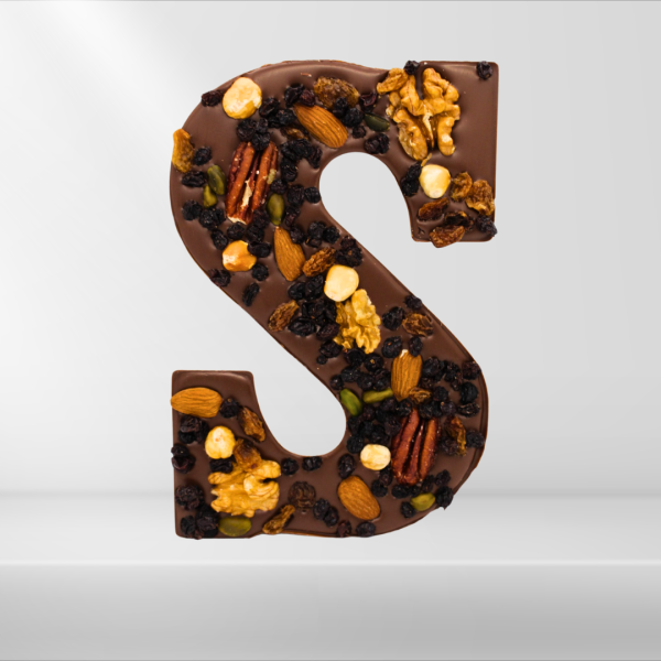 Chocolade letter S studentenhaver met verse noten. Te verkrijgen in melk, wit en pure chocolade.